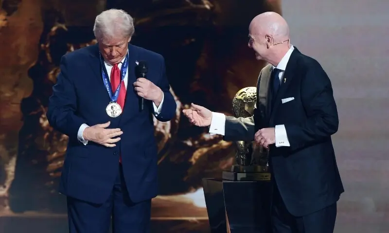 واشنگٹن کے کینیڈی سینٹر میں فیفا ورلڈ کپ 2026 کے ڈرا سے قبل منعقدہ تقریب اس وقت توجہ کا مرکز بن گئی جب فیفا کے صدر جیانی انفینٹینو نے امریکی صدر ڈونلڈ ٹرمپ کو پہلا ”فیفا پیس پرائز“ پیش کیا۔