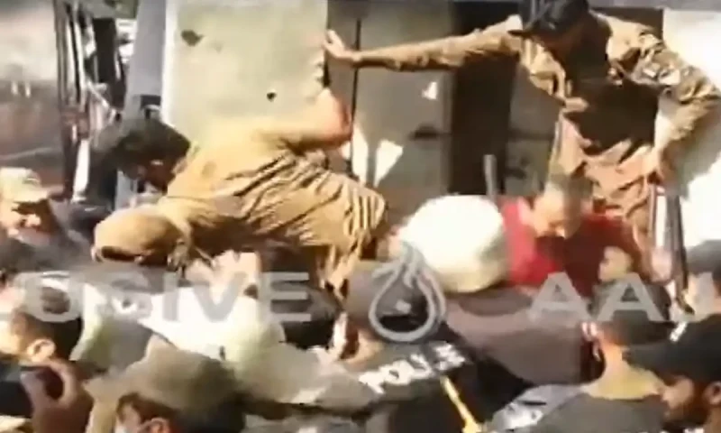 پولیس کی جانب سے مظاہرین کی گرفتاری کا عمل شروع ہوچکا ہے، پولیس نے مظاہرین کو قیدیوں کی وین میں بیٹھا کرلے جانا شروع کردیا۔ اس دوران مظاہرین نے قیدیوں کی وین کے شیشے بھی توڑ دئیے اور وین کے آگے نعرے بازی بھی کی۔